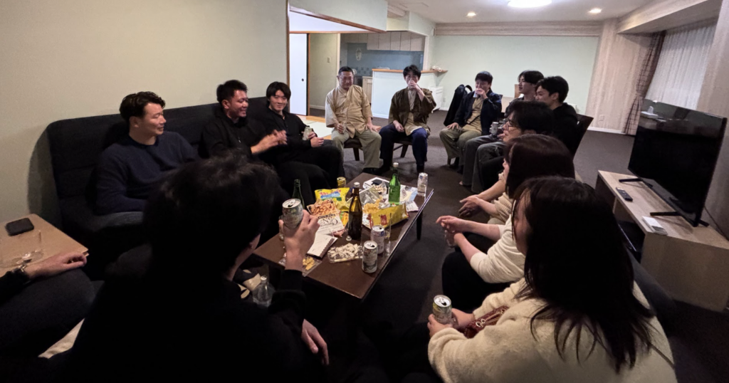 しかし、アドバンサーの夜はそれだけでは終わりません。 一次会終了後も、各部屋では深夜まで「熱い議論」が繰り広げられました。一晩を共にする合宿形式だからこそ、普段の業務ではなかなか出せない**「本音」や「志」**をぶつけ合うことができ、拠点間の見えない壁が完全に崩れ去った瞬間でした。